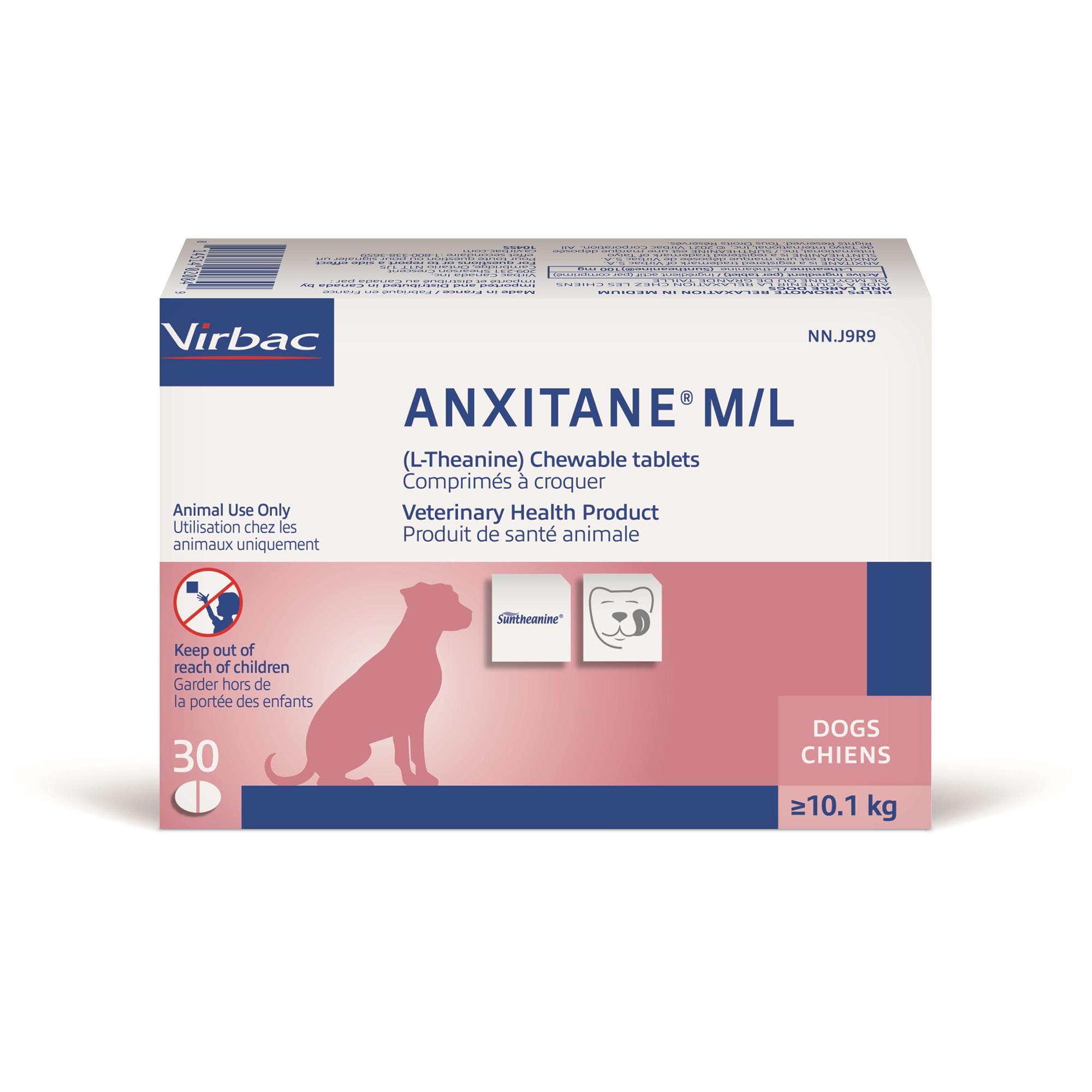 Helps calm and relax pets exhibiting nervousness, anxiety, or behavior changes in response to environmental stress. Chewable tablets containing L-Theanine (Suntheanine®), an amino acid indicated for use in cats and dogs to help keep them calm and relaxed. ANXITANE M&L Tablets are for medium and large dogs (22 lb or more).