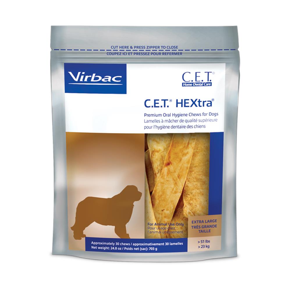 CET HEXtra Premium Chews for dogs combines the mechanical action of rawhide, antibacterial power of chlorhexidine, and the C.E.T. Dual Enzyme System for added antibacterial action and superior plaque control. Made from select beef hide, the added plaque-fighting enzymes and natural abrasive cleansing action of C.E.T. Chews help to keep breath fresh and teeth clean. For dogs weighing over 23 kg (51 lbs.).