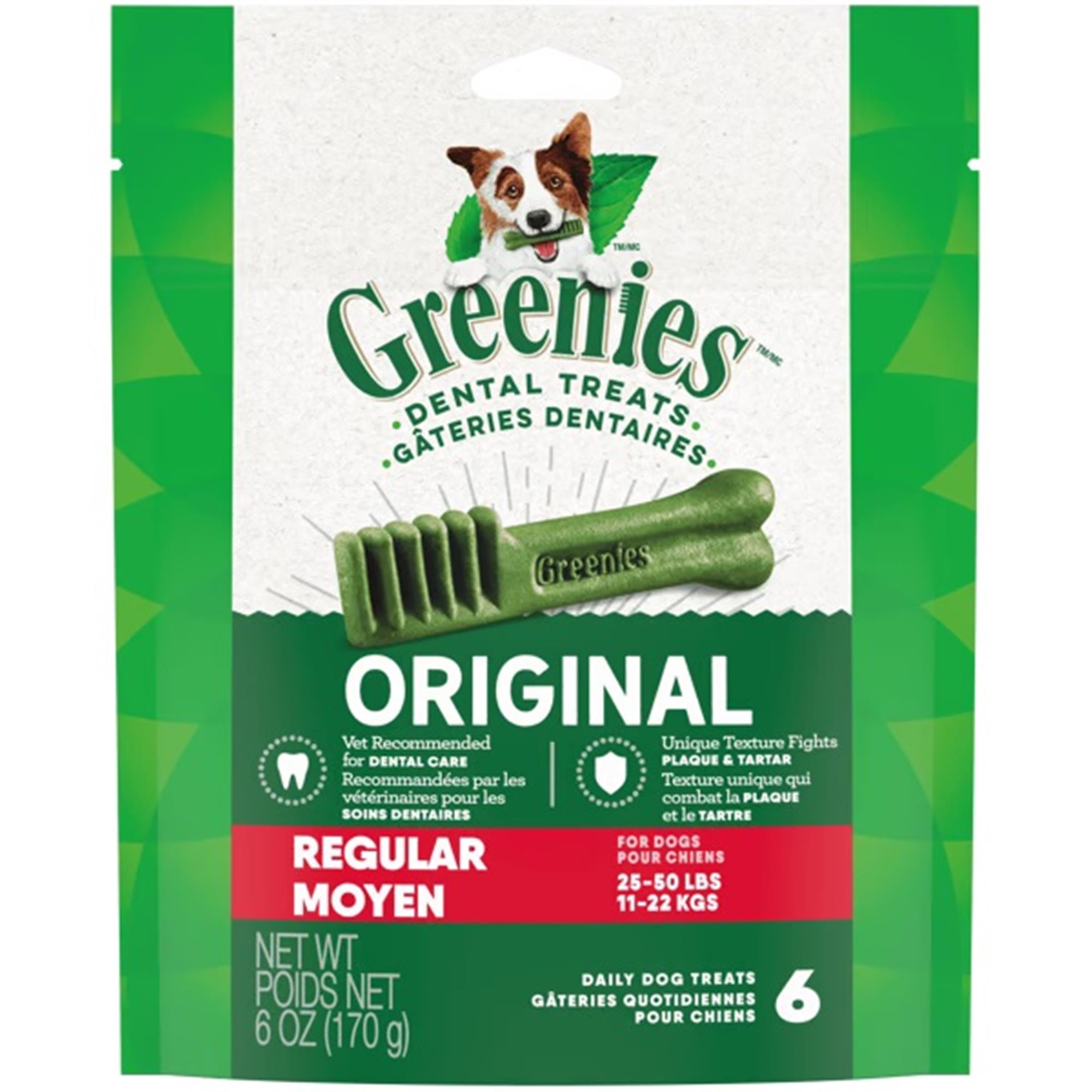 One GREENIES® dental chew a day helps control harmful plaque and tartar build up and freshens breath. GREENIES® dental chews are filled with high-quality, easily digestible proteins that break down into little teeth-cleaning, easy to swallow and digestible bits. Plus, added vitamins and minerals make them a complete and balanced part of your adult dog’s daily diet. For dogs 25-50 lbs or 11-22 kg.