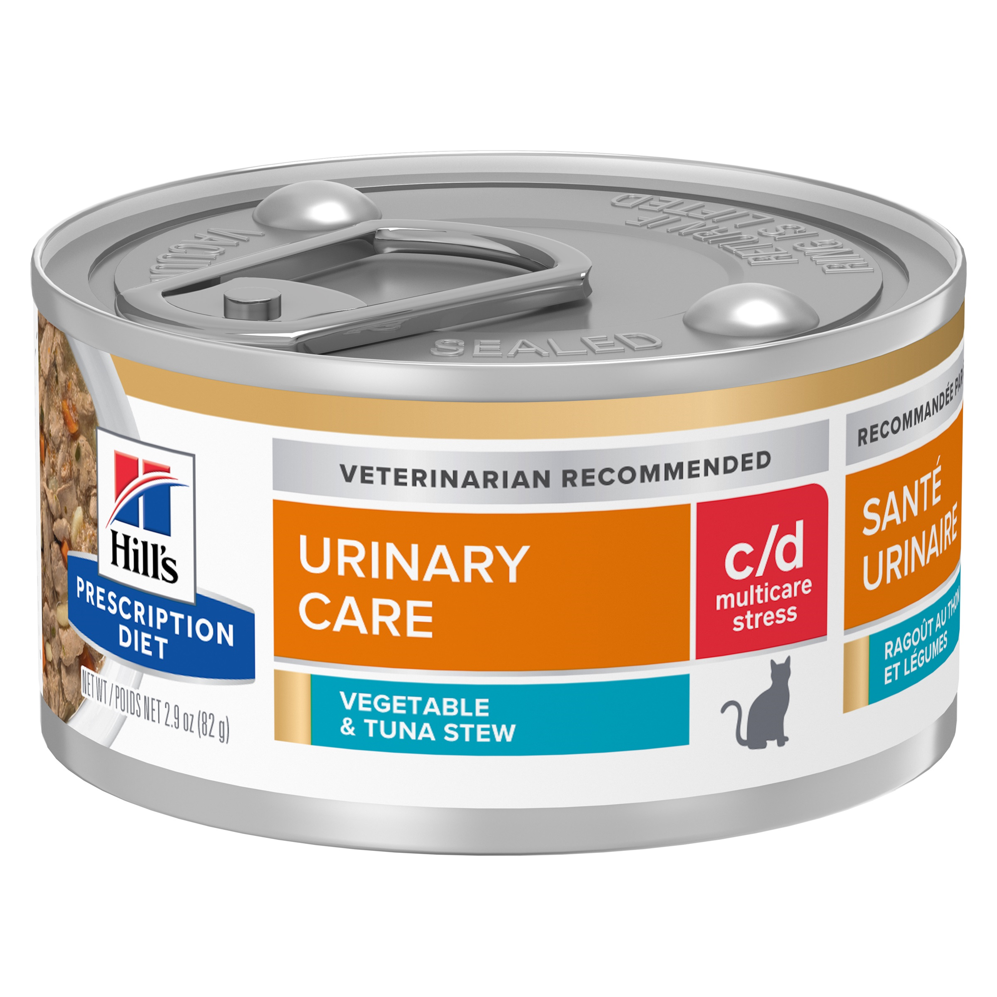 Prescription Diet c/d Multicare Stress cat food is nutrition that provides 8x greater success in reducing common urinary signs,* with ingredients to manage stress related urinary episodes *Versus scientific control,Water, Pork Liver, Carrots, Chicken, Wheat Gluten, Tuna, Rice, Spinach, Corn Starch, Hydrolyzed Chicken Flavor, Chicken Fat, Soybean Oil, Potassium Alginate, Fish Oil, Calcium Chloride, Dicalcium Phosphate, Potassium Citrate, Guar Gum, Calcium Sulfate, Choline Chloride, Taurine, vitamins (Vitamin E Supplement, Thiamine Mononitrate, Niacin Supplement, Calcium Pantothenate, Vitamin B12 Supplement, Pyridoxine Hydrochloride, Biotin, Riboflavin Supplement, Menadione Sodium Bisulfite Complex (source of Vitamin K), Folic Acid, Vitamin D3 Supplement), Sodium Tripolyphosphate, Dried Hydrolyzed Casein, Iodized Salt, L-Tryptophan, minerals (Zinc Oxide, Ferrous Sulfate, Manganese Sulfate, Copper Sulfate, Calcium Iodate), Calcium Carbonate,Adult Maintenance Daily Feeding Guide