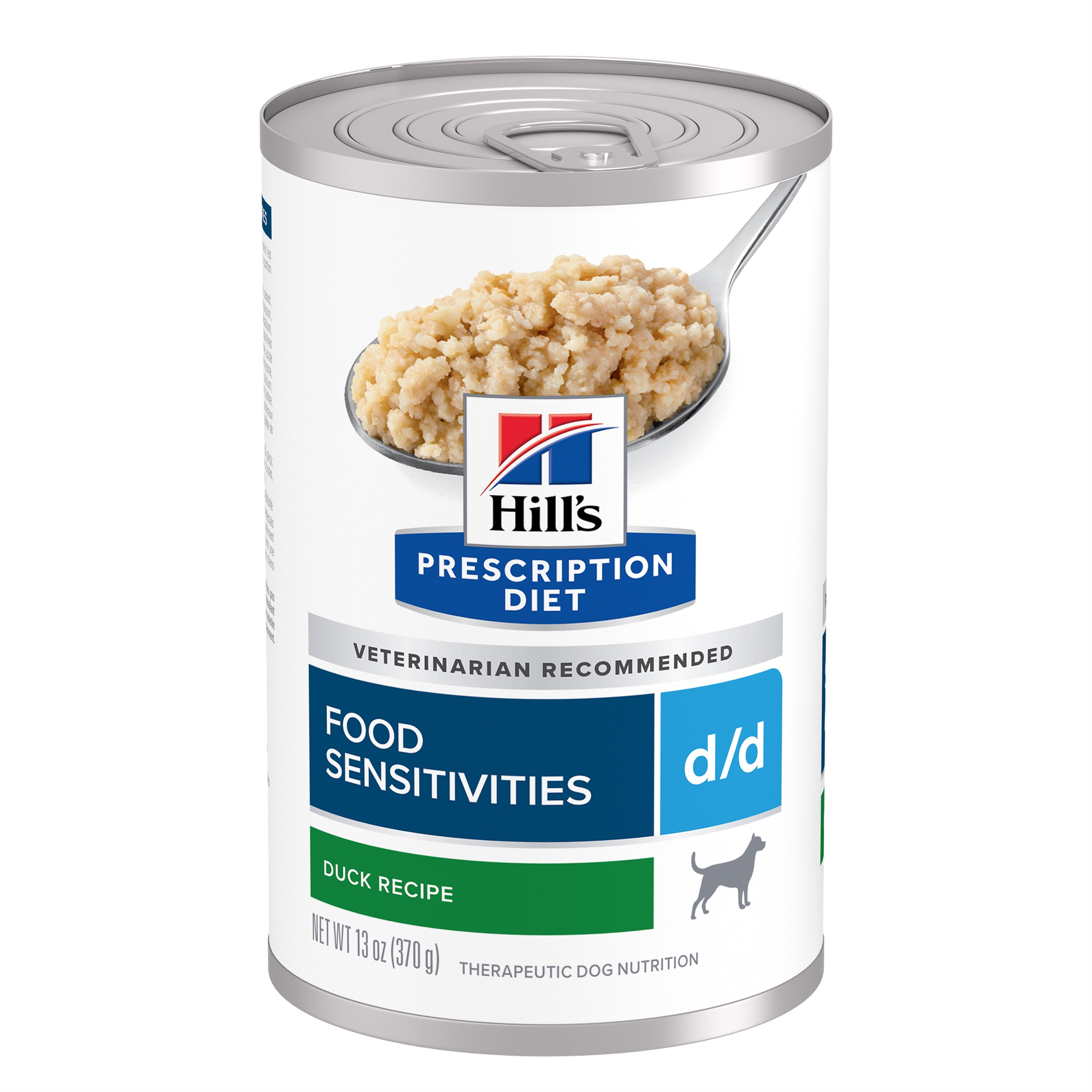 Prescription Diet d/d is clinical nutrition specially formulated with novel protein to help avoid reactions to food in dogs. It’s made with thoughtfully sourced ingredients you can trust, and was developed by Hill’s nutritionists and veterinarians. Please consult your veterinarian for further information on how Prescription Diet foods can help your dog continue to enjoy a happy and active life.,Water, Duck, Potato, Duck Liver, Potato Starch, Soybean Oil, Powdered Cellulose, Dicalcium Phosphate, Fish Oil, Iodized Salt, DL-Methionine, Calcium Carbonate, Taurine, vitamins (Vitamin E Supplement, Ascorbic Acid (source of Vitamin C), Thiamine Mononitrate, Niacin Supplement, Vitamin A Supplement, Calcium Pantothenate, Vitamin B12 Supplement, Pyridoxine Hydrochloride, Biotin, Riboflavin Supplement, Vitamin D3 Supplement, Folic Acid, Menadione Sodium Bisulfite Complex (source of Vitamin K)), Potassium Chloride, Choline Chloride, minerals (Zinc Oxide, Ferrous Sulfate, Manganous Oxide, Copper Sulfate, Cobalt Carbonate, Calcium Iodate, Sodium Selenite), L-Tryptophan, Beta-Carotene.,PD Canine d/d Duck Can – Adult maintenance – using 13 oz (370 g) canDaily Feeding GuideWeight of Dog Amount per Day 5 lb (2,3 kg) 1/2 can 10 lb (4,5 kg) 1 can 15 lb (6,8 kg) 1 1/4 can 20 lb (9,1 kg) 1 1/2 can 30 lb (14 kg) 2 1/4 can 40 lb (18 kg) 2 2/3 can 50 lb (23 kg) 3 1/4 can 60 lb (27 kg) 3 2/3 can 70 lb (32 kg) 4 can 80 lb (36 kg) 4 1/2 can 100 lb (45 kg) 5 1/4 can