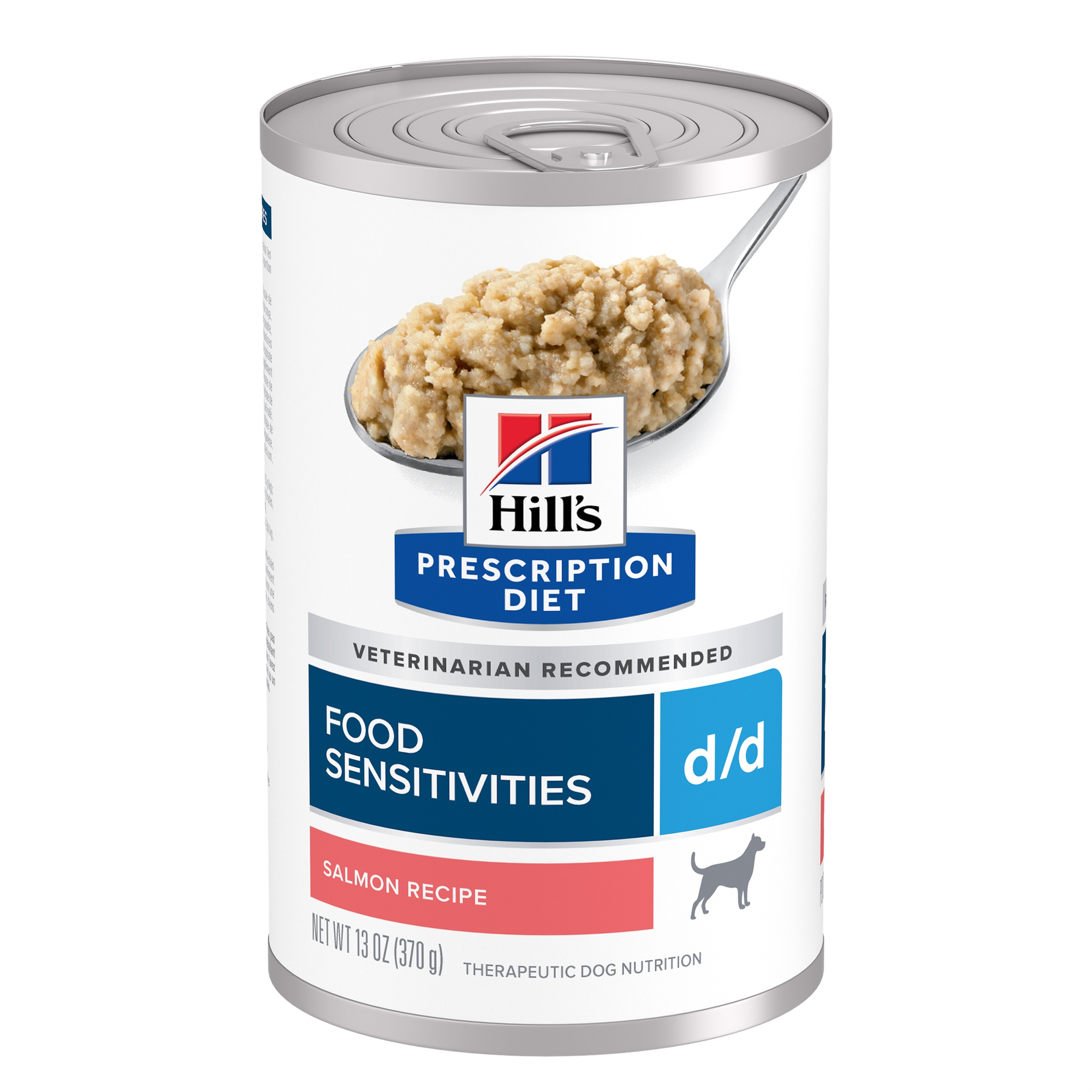 Prescription Diet d/d is clinical nutrition specially formulated with novel protein to help avoid reactions to food in dogs. It’s made with thoughtfully sourced ingredients you can trust, and was developed by Hill’s nutritionists and veterinarians. Please consult your veterinarian for further information on how Prescription Diet foods can help your dog continue to enjoy a happy and active life.,Water, Salmon, Potatoes, Potato Starch, Potato Protein, Soybean Oil, Fish Oil, Powdered Cellulose, Potassium Citrate, Choline Chloride, vitamins (Vitamin E Supplement, L-Ascorbyl-2-Polyphosphate (source of Vitamin C), Thiamine Mononitrate, Niacin Supplement, Vitamin A Supplement, Calcium Pantothenate, Biotin, Vitamin B12 Supplement, Pyridoxine Hydrochloride, Riboflavin Supplement, Folic Acid), Iodized Salt, Dicalcium Phosphate, DL-Methionine, Taurine, L-Tryptophan, L-Lysine, minerals (Ferrous Sulfate, Zinc Oxide, Copper Sulfate, Manganese Sulfate, Calcium Iodate), Magnesium Oxide, Beta-Carotene.,Adult maintenanceDaily Feeding GuideWeight of Dog – lbs (kgs) Amount per Day – 13 oz (370 g) cans 5 (2,3) 1/2 10 (4,5) 1 15 (6,8) 1 1/4 20 (9,1) 1 1/2 30 (14) 2 40 (18) 2 1/2 50 (23) 3 60 (27) 3 1/2 70 (32) 3 3/4 80 (36) 4 1/4 100 (45) 5 120 (54) 5 3/4