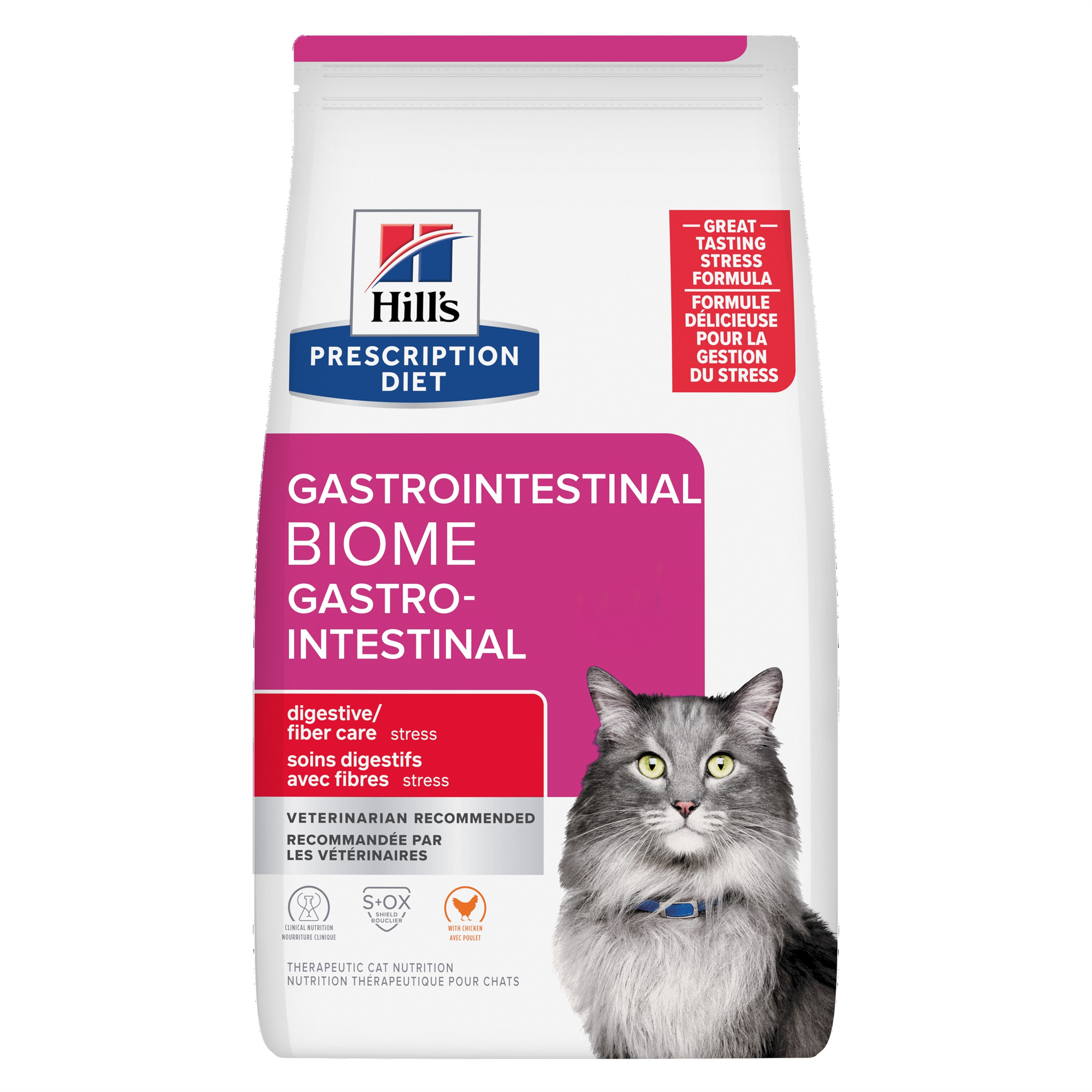 Hill’s nutritionists and veterinarians formulated Prescription Diet Gastrointestinal Biome Stress nutrition with ActivBiome+, a proprietary ingredient technology, clinically formulated to promote regular healthy stool in as little as 24 hours. Gastrointestinal Biome Stress also has added ingredients to help reduce stress.,Chicken, Brewers Rice, Corn Protein Meal, Chicken Fat, Wheat Gluten, Pea Protein, Whole Grain Corn, Chicken Meal, Whole Grain Oats, Ground Pecan Shells, Cracked Pearled Barley, Dried Beet Pulp, Chicken Liver Flavor, Flaxseed, Psyllium Seed Husk, Dried Citrus Pulp, Fish Oil, Lactic Acid, L-Lysine, Pumpkin, Pressed Cranberries, Fructooligosaccharides (FOS), Potassium Chloride, DL-Methionine, Choline Chloride, Taurine, Iodized Salt, vitamins (Vitamin E Supplement, L-Ascorbyl-2-Polyphosphate (source of Vitamin C), Niacin Supplement, Thiamine Mononitrate, Vitamin A Supplement, Calcium Pantothenate, Riboflavin Supplement, Biotin, Vitamin B12 Supplement, Pyridoxine Hydrochloride, Folic Acid, Vitamin D3 Supplement), Dried Hydrolyzed Casein, Calcium Sulfate, L-Tryptophan, minerals (Ferrous Sulfate, Zinc Oxide, Copper Sulfate, Manganous Oxide, Calcium Iodate, Sodium Selenite), Mixed Tocopherols for freshness, Natural Flavors, Beta-Carotene.,Adult maintenanceDaily Feeding Guide Weight of Cat – lbs (kgs) Amount per Day – cups (grams) 6 (2,7) 3/8 (40) 8 (3,6) 1/2 (55) 10 (4,5) 5/8 (70) 12 (5,4) 3/4 (85) 14 (6,4) 3/4 (85) 16 (7,3) 7/8 (95) 18 (8,2) 1 (110)