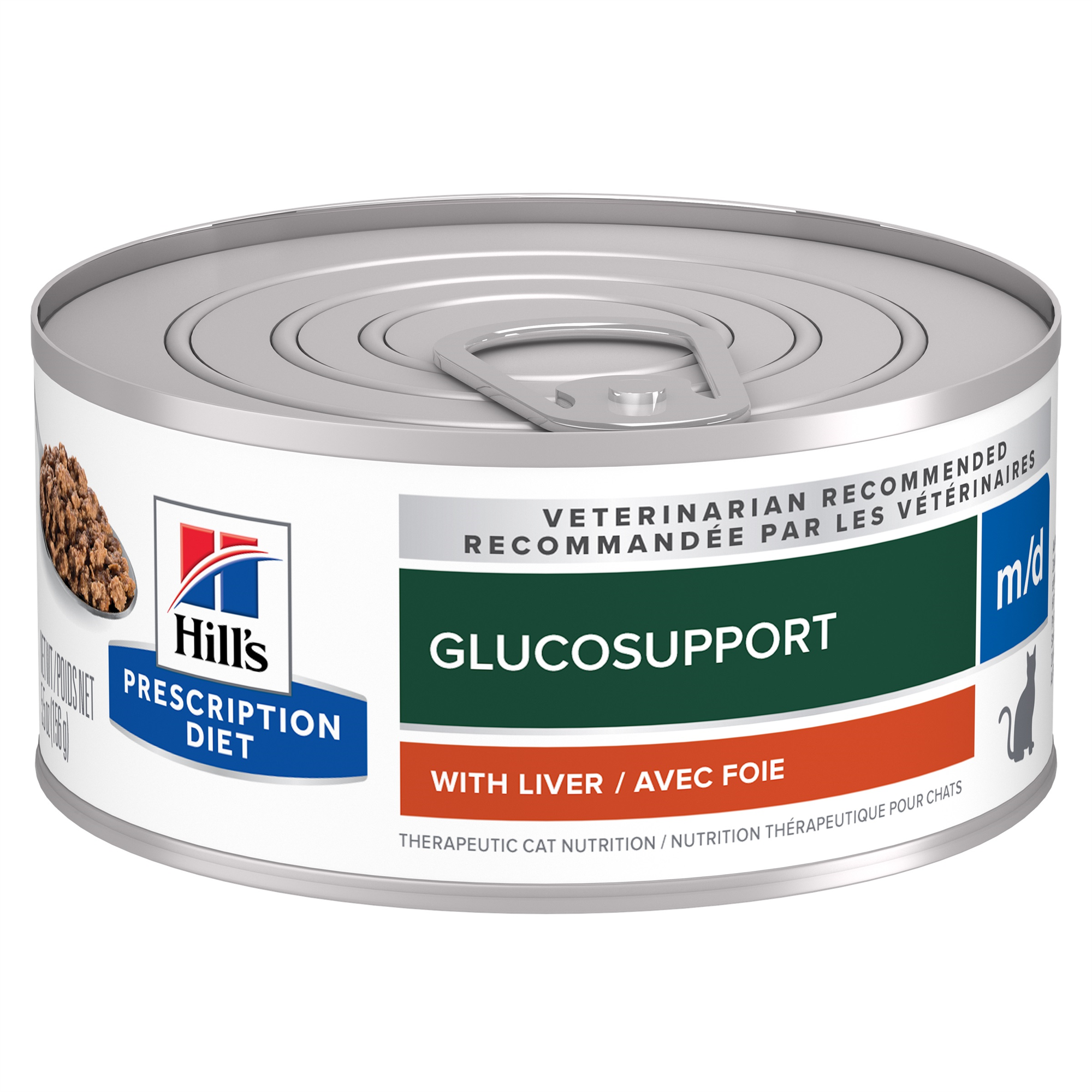 Prescription Diet m/d is clinical nutrition tested to manage glucose and weight for cats. It’s made in the USA with global ingredients you can trust, and was developed by Hill’s nutritionists and veterinarians. This food is also formulated to promote a urinary environment that reduces the risk of developing struvite and calcium oxalate crystals. Please consult your veterinarian for further information on how Prescription Diet foods can help your cat continue to enjoy a happy and active life.,Pork Liver, Pork By-Products, Water, Chicken Fat, Corn Starch, Potato Protein, Calcium Sulfate, Powdered Cellulose, Natural Flavor, Guar Gum, Fish Oil, Iodized Salt, Potassium Chloride, Locust Bean Gum, Taurine, Carrageenan, DL-Methionine, vitamins (Vitamin E Supplement, L-Ascorbyl-2-Polyphosphate (source of Vitamin C), Thiamine Mononitrate, Niacin Supplement, Calcium Pantothenate, Vitamin B12 Supplement, Pyridoxine Hydrochloride, Biotin, Riboflavin Supplement, Menadione Sodium Bisulfite Complex (source of Vitamin K), Vitamin D3 Supplement, Folic Acid), Choline Chloride, L-Carnitine, L-Lysine, minerals (Zinc Oxide, Ferrous Sulfate, Manganese Sulfate, Copper Sulfate, Calcium Iodate), Beta-Carotene.,Weight ControlDaily Feeding Guide||Ideal Weight of Cat – lbs (kgs) Amount per Day – 5.5 oz (156 g) cans – Weight loss Amount per Day – 5.5 oz (156 g) cans – Adult maintenance 6 (2,7) 2/3 1 8 (3,6) 3/4 1 1/4 10 (4,5) 1 1 1/2 12 (5,4) 1 1/4 1 3/4 14 (6,4) 1 1/3 2 16 (7,3) 1 1/2 2 1/4 18 (8,2) 1 1/2 2 1/3