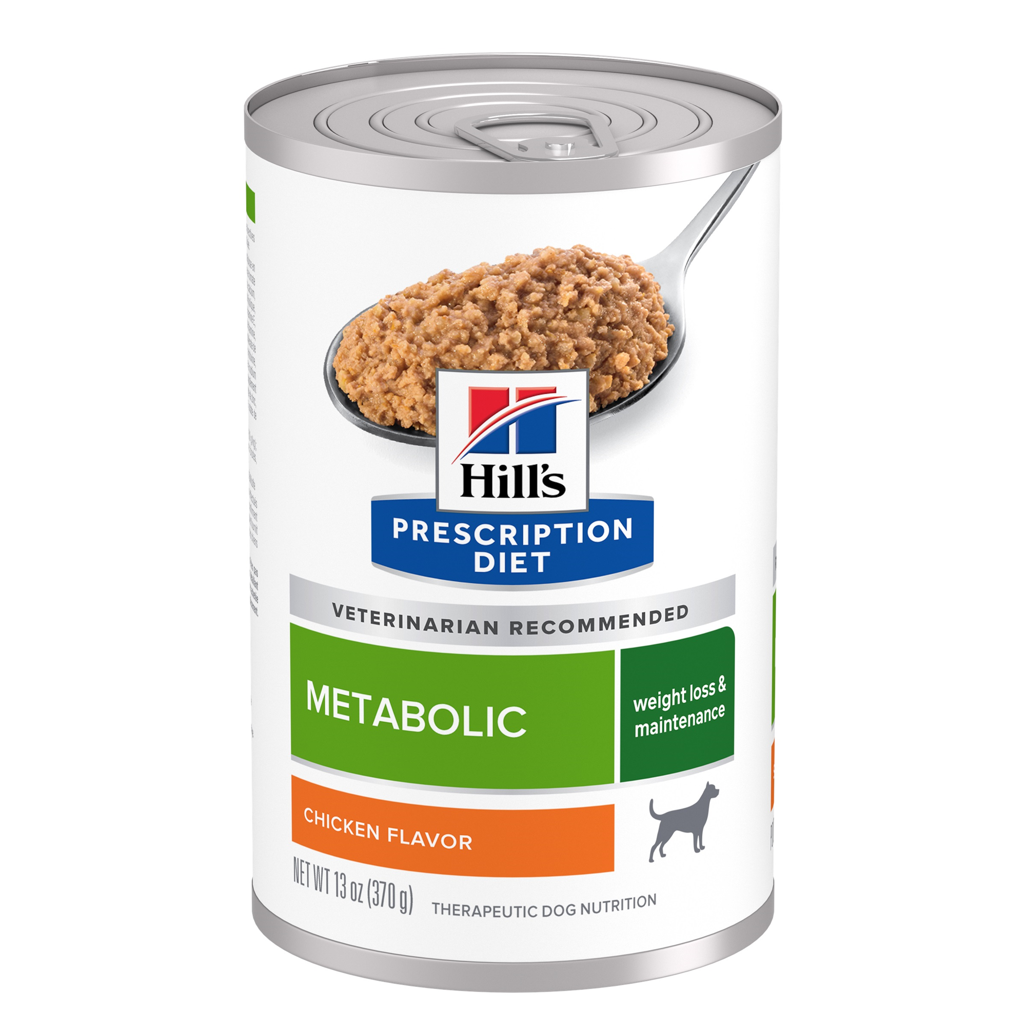 Prescription Diet Metabolic is clinical nutrition proven to help dogs lose 13% of body weight in 2 months. It’s made in the USA with global ingredients you can trust, and was developed by Hill’s nutritionists and veterinarians. This food was also formulated to promote a urinary environment that reduces the risk of developing struvite and calcium oxalate crystals. Please consult your veterinarian for further information on how Prescription Diet foods can help your dog continue to enjoy a happy and active life.,Water, Pork Liver, Whole Grain Corn, Chicken, Powdered Cellulose, Rice, Pork by-Products, Dried Tomato Pomace, Flaxseed, Egg Whites, Coconut Oil, Calcium Carbonate, DL-Methionine, Potassium Chloride, Carrots, Lipoic Acid, Sodium Tripolyphosphate, Leucine, Iodized Salt, vitamins (Vitamin E Supplement, Ascorbic Acid (source of Vitamin C), Thiamine Mononitrate, Niacin Supplement, Pyridoxine Hydrochloride, Calcium Pantothenate, Vitamin B12 Supplement, Riboflavin Supplement, Biotin, Vitamin D3 Supplement, Folic Acid), Taurine<(>,<)> minerals (Manganese Sulfate, Zinc Oxide, Ferrous Sulfate, Copper Sulfate, Calcium Iodate) <(>,<)> L-Carnitine<(>,<)> Beta-Carotene,Canine Metabolic Prescription Diet Can – Weight Control – using 13 oz (370 g) canDaily Feeding GuideIdeal Weight of Dog Weight Loss Weight Control 5 lb (2,3 kg) 3/8 can 5/8 can 10 lb (4,5 kg) 2/3 can 1 can 15 lb (6,8 kg) 1 can 1 1/2 can 20 lb (9,1 kg) 1 1/4 can 1 3/4 can 30 lb (14 kg) 1 1/2 can 2 1/2 can 40 lb (18 kg) 2 can 3 can 50 lb (23 kg) 2 1/4 can 3 1/2 can 60 lb (27 kg) 2 1/2 can 4 can 70 lb (32 kg) 3 can 4 2/3 can 80 lb (36 kg) 3 1/4 can 5 can 100 lb (45 kg) 3 3/4 can 6 can