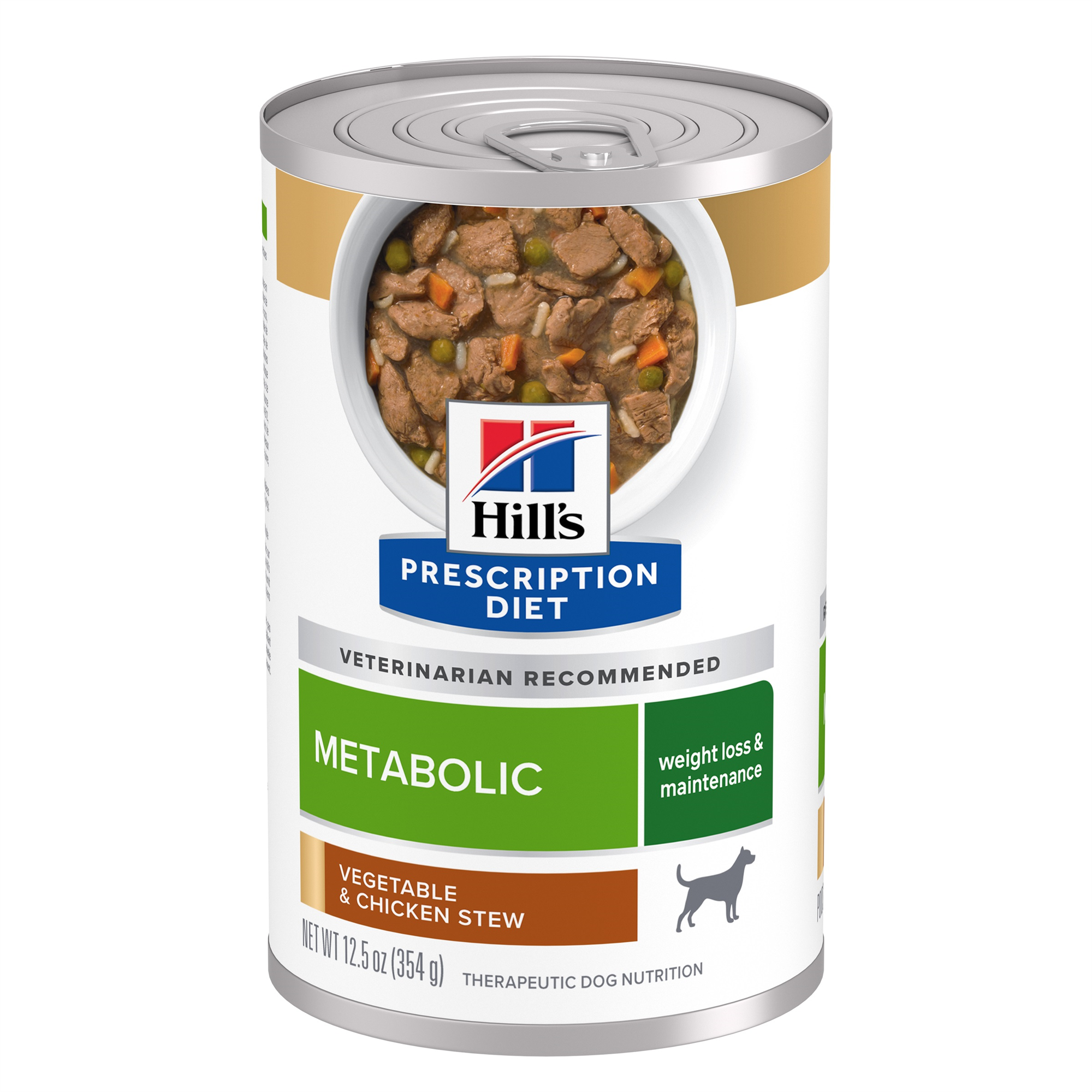 Prescription Diet Metabolic is clinical nutrition proven to help dogs lose 13% of body weight in 2 months. It’s made in the USA with global ingredients you can trust, and was developed by Hill’s nutritionists and veterinarians. This food was also formulated to promote a urinary environment that reduces the risk of developing struvite and calcium oxalate crystals. Please consult your veterinarian for further information on how Prescription Diet foods can help your dog continue to enjoy a happy and active life.,Water, Pork Liver, Carrots, Green Peas, Rice, Powdered Cellulose, Corn Starch, Wheat Gluten, Chicken, Flaxseed, Dried Tomato Pomace, Chicken Liver Flavor, Coconut Oil, Potassium Alginate, Calcium Chloride, Egg Flavor, Calcium Lactate, Fish Oil, Dicalcium Phosphate<(>,<)> Guar Gum, Lipoic Acid, Sodium Tripolyphosphate, vitamins (Vitamin E Supplement, Thiamine Mononitrate, Ascorbic Acid (source of Vitamin C), Niacin Supplement, Pyridoxine Hydrochloride, Menadione Sodium Bisulfite Complex (source of Vitamin K), Vitamin B12 Supplement, Calcium Pantothenate, Riboflavin Supplement, Biotin, Folic Acid<(>,<)> Vitamin D3 Supplement) <(>,<)> L-Lysine, Potassium Citrate, Iodized Salt, Taurine, minerals (Zinc Oxide, Ferrous Sulfate, Manganese Sulfate<(>,<)> Copper Sulfate, Calcium Iodate), L-Carnitine, Beta-Carotene,PD Canine Metabolic Vegetable & Chicken Stew Can – Weight Control – using 12.5 oz (354 g) canDaily Feeding GuideIdeal Weight of Dog Weight Loss Weight Control 5 lb (2,3 kg) 1/2 can 7/8 can 10 lb (4,5 kg) 1 can 1 1/3 can 15 lb (6,8 kg) 1 1/4 can 2 can 20 lb (9,1 kg) 1 1/2 can 2 1/3 can 30 lb (14 kg) 2 can 3 1/4 can 40 lb (18 kg) 2 1/2 can 4 can 50 lb (23 kg) 3 can 4 2/3 can 60 lb (27 kg) 3 1/3 can 5 1/3 can 70 lb (32 kg) 3 3/4 can 6 can 80 lb (36 kg) 4 1/4 can 6 2/3 can 100 lb (45 kg) 5 can 8 can