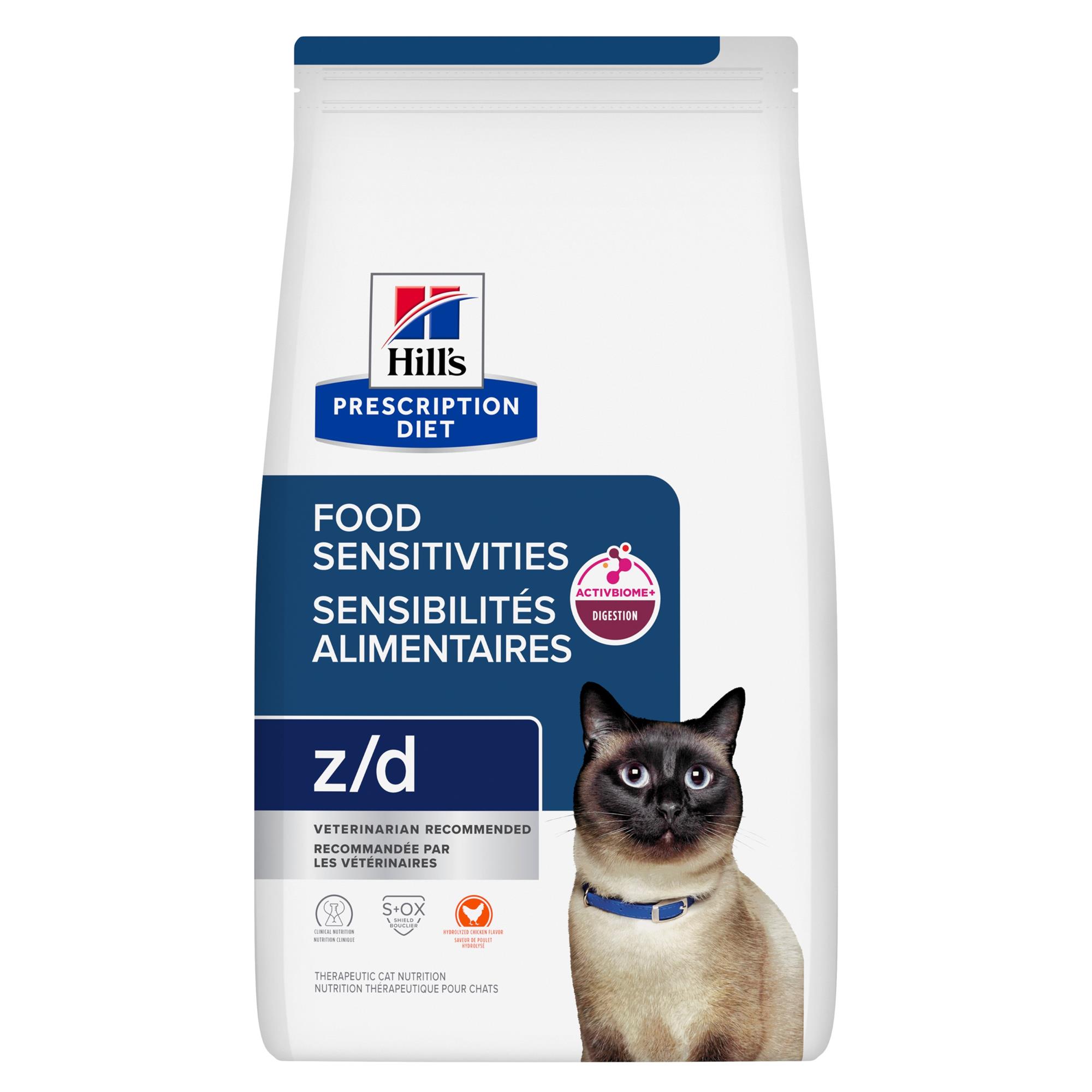 Prescription Diet z/d is clinical nutrition specially formulated to help avoid skin and digestive signs from adverse food reactions in cats. It’s made in the USA with global ingredients you can trust, and was developed by Hill’s nutritionists and veterinarians. This food is formulated to promote an environment that makes it difficult for struvite and calcium oxalate crystals to form. It also has clinically proven antioxidants to help support a healthy immune system. Please consult your veterinarian for further information on how Prescription Diet foods can help your cat continue to enjoy a happy and active life.,Brewers Rice, Hydrolyzed Chicken Liver, Rice Protein Concentrate, Powdered Cellulose, Soybean Oil, Coconut Oil, Chicken Liver Flavor, Calcium Carbonate, Lactic Acid, Potassium Chloride, Calcium Sulfate, Glyceryl Monostearate, Dicalcium Phosphate, L-Threonine, DL-Methionine, L-Lysine, Choline Chloride, vitamins (Vitamin E Supplement, L-Ascorbyl-2-Polyphosphate (source of Vitamin C), Niacin Supplement, Thiamine Mononitrate, Calcium Pantothenate, Vitamin A Supplement, Pyridoxine Hydrochloride, Biotin, Riboflavin Supplement, Vitamin B12 Supplement, Folic Acid, Vitamin D3 Supplement), Taurine, Iodized Salt, Potassium Citrate, L-Tryptophan, minerals (Ferrous Sulfate, Zinc Oxide, Copper Sulfate, Manganous Oxide, Calcium Iodate, Sodium Selenite), Mixed Tocopherols for freshness, Natural Flavors, Beta-Carotene.,Adult maintenanceDaily Feeding Guide|Weight of Cat – lbs (kgs) Amount per Day – cups (grams) 6 (2,7) 3/8 (40) 8 (3,6) 1/2 (55) 10 (4,5) 5/8 (70) 12 (5,4) 3/4 (85) 14 (6,4) 7/8 (95) 16 (7,3) 7/8 (95) 18 (8,2) 1 (110)