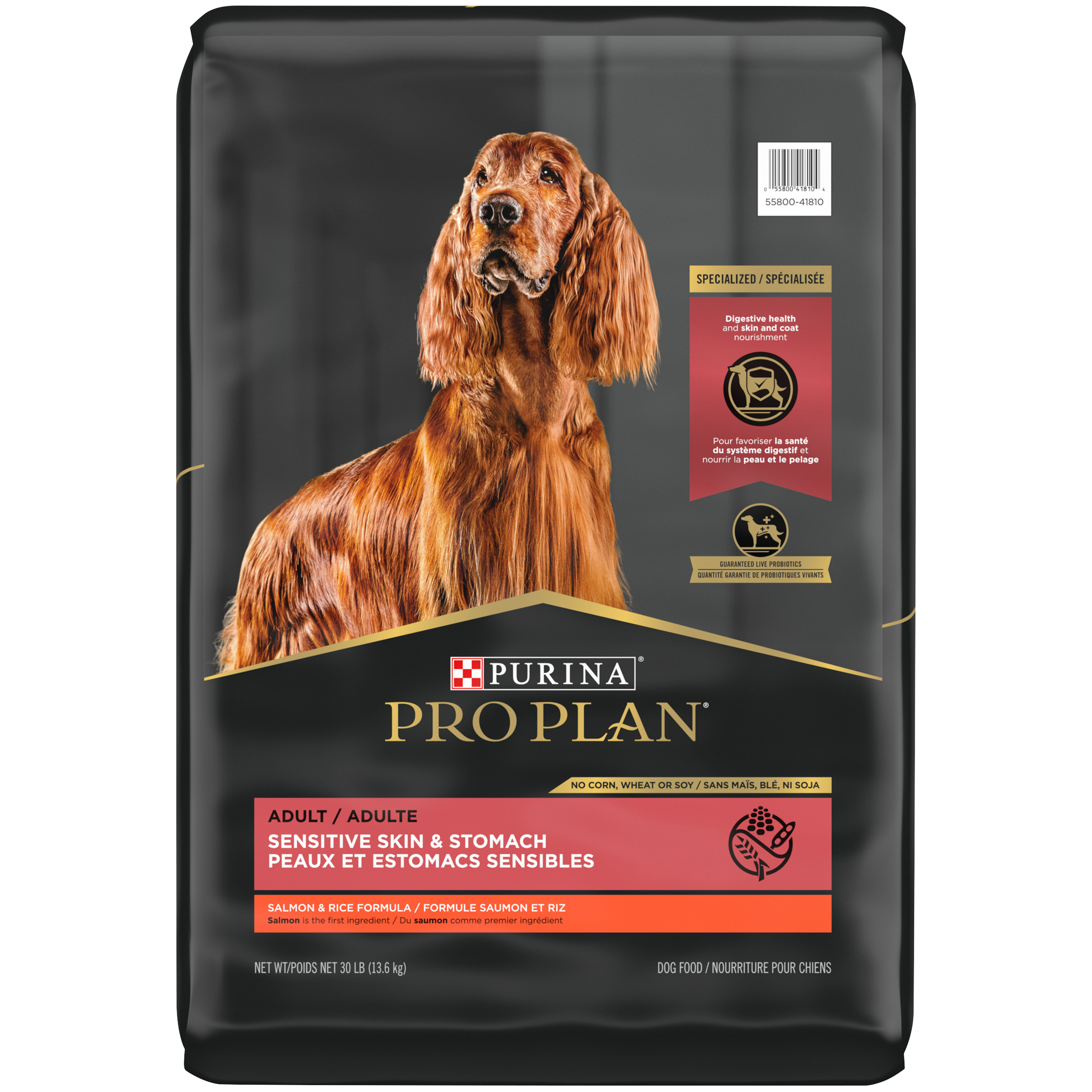 Nurture your dog’s sensitive skin and stomach with Purina Pro Plan Brand Dog Food Sensitive Skin & Stomach Salmon & Rice Formula adult dry dog food. Nutrient-rich salmon is the first ingredient and a high-quality source of protein in this formula. Also containing prebiotic fibre, this dog food for sensitive stomachs boasts a highly digestible formula and nourishes the beneficial bacteria found in your dog’s intestine for his digestive health. Ingredients such as rice and oat meal provide easily digestible sources of carbohydrates for your dog. Meanwhile, fish oil — rich in EPA, one of the omega-3 fatty acids — helps support healthy joints and mobility, while omega-6 fatty acids and vitamin A nourish your dog’s skin and keep his coat looking healthy. There is also no corn, wheat or soy in our Sensitive Skin & Stomach Formula. It’s important to know the food you choose for your dog will help keep him healthy, happy and feeling extraordinary, and that’s what Purina Pro Plan Brand Dog Food Sensitive Skin & Stomach Salmon & Rice Formula adult dry dog food does.,Salmon, Barley, Rice, Oat Meal, Canola Meal, Fish Meal (Source of Glucosamine), Beef Fat Preserved with Mixed-Tocopherols, Salmon Meal (Source of Glucosamine), Dried Yeast, Natural Flavor, Sunflower Oil, Chicory Root Inulin, Fish Oil, L-Lysine Monohydrochloride, Salt, Potassium Chloride, DL-Methionine, Vitamins [Vitamin E Supplement, Niacin (Vitamin B-3), Vitamin A Supplement, Calcium Pantothenate (Vitamin B-5), Thiamine Mononitrate (Vitamin B-1), Vitamin B-12 Supplement, Riboflavin Supplement (Vitamin B-2), Pyridoxine Hydrochloride (Vitamin B-6), Folic Acid (Vitamin B-9), Menadione Sodium Bisulfite Complex (Vitamin K), Vitamin D-3 Supplement, Biotin (Vitamin B-7)], Calcium Carbonate, Minerals [Zinc Sulfate, Ferrous Sulfate, Manganese Sulfate, Copper Sulfate, Calcium Iodate, Sodium Selenite], Choline Chloride, L-Ascorbyl-2-Polyphosphate (Vitamin C), Dried Bacillus Coagulans Fermentation Product. L444919.,We recommend that you keep your dog in ideal body condition and not allow your dog to become overweight. The exact amount of food your dog requires will need to be adjusted according to age, activity and environment. But a good place to start is with these guidelines for an average, active, adult dog fed once daily. Making the Switch to Pro Plan: Although you’ll be anxious to see the difference Pro Plan can make in your dog, please allow 7–10 days to ease the transition from your dog’s current food. Each day, simply feed a little less of the previous food and a little more Pro Plan until you’re feeding Pro Plan exclusively. This gradual transition will help avoid dietary upsets. Contains a source of live (viable) naturally occurring microorganisms. Provide adequate fresh water in a clean container daily. For your pet’s health, see your veterinarian regularly.