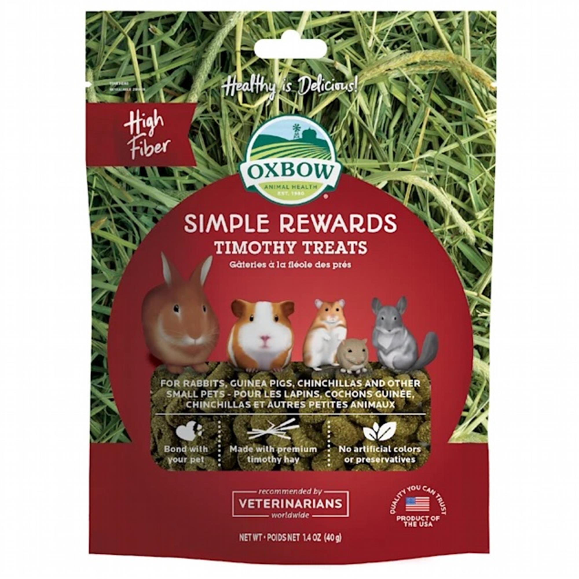 Everyone knows that fiber is crucial to a small pet’s diet. At Oxbow, we think taste should be too. That’s why we’ve created Simple Rewards Timothy Treats. Made of high-quality, fiber-rich timothy grass hay, our treats offer the fresh Timothy flavor and aroma animals love. They’re as wholesome as they are delicious, too. Use Timothy Treats to add variety and enrichment to your pet’s diet. Simple Rewards Timothy Treats allow you to give your animal a healthy, delicious treat you can both feel good about.
