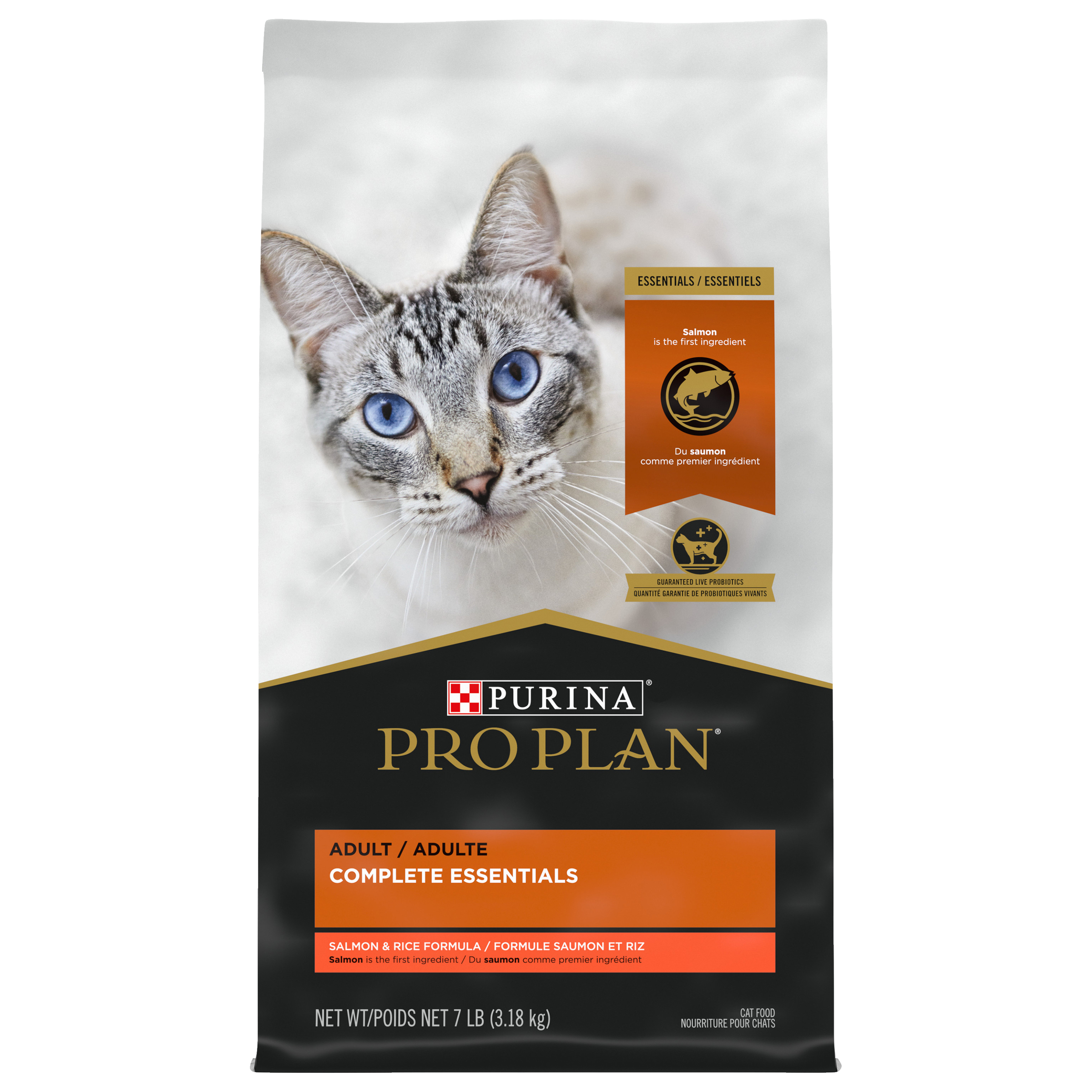 Give your cat the high-quality meals and advanced nutrition she deserves with Purina Pro Plan COMPLETE ESSENTIALS Salmon & Rice Formula adult dry cat food. This cat food kibble features guaranteed live probiotics to promote digestive health and delivers high-quality protein, including real salmon as the first ingredient. Every high-quality ingredient in this dry cat food is carefully chosen for a specific purpose, so you can feel confident every time you fill your feline’s dish. Vitamin A and linoleic acid, an omega fatty acid, help to nourish her skin and coat, while antioxidants help support her immune system health, so your cat looks and feels her best every day. With a taste and texture sure to capture her attention, this cat food formula delivers the sensory experience cats love. Tend to her nutritional needs and please her palate with this dry cat food as part of her daily routine.,Salmon, Rice, Corn Gluten Meal, Poultry By-Product Meal, Wheat Flour, Dried Egg Product, Beef Fat Preserved with Mixed-Tocopherols, Soy Protein Concentrate, Fish Meal, Natural Flavor, Chicory Root Inulin, Calcium Carbonate, Phosphoric Acid, Potassium Chloride, Salt, Caramel Color, Vitamins [Vitamin E Supplement, Niacin (Vitamin B-3), Vitamin A Supplement, Calcium Pantothenate (Vitamin B-5), Thiamine Mononitrate (Vitamin B-1), Riboflavin Supplement (Vitamin B-2), Vitamin B-12 Supplement, Pyridoxine Hydrochloride (Vitamin B-6), Folic Acid (Vitamin B-9), Vitamin D-3 Supplement, Biotin (Vitamin B-7), Menadione Sodium Bisulfite Complex (Vitamin K)], Choline Chloride, Taurine, Minerals [Zinc Sulfate, Ferrous Sulfate, Manganese Sulfate, Copper Sulfate, Calcium Iodate, Sodium Selenite], L-Lysine Monohydrochloride, Dried Bacillus Coagulans Fermentation Product. U463019.,Feeding for Adult Maintenance: