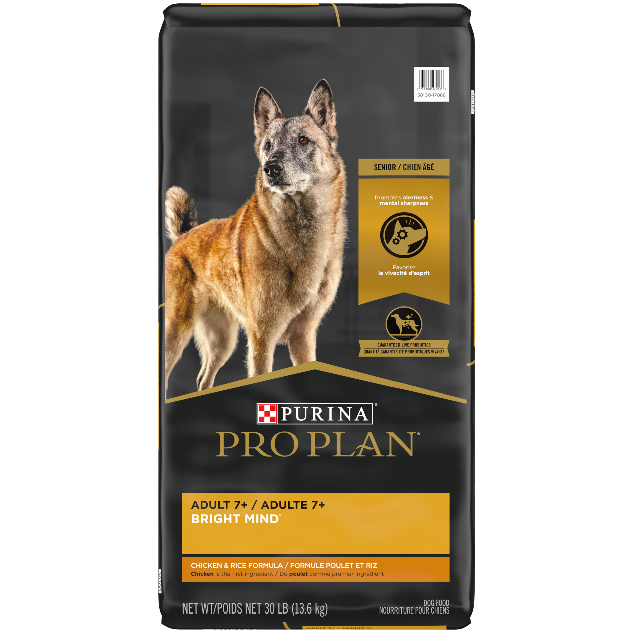 Nourish your dog’s mind and help him think more like he did when he was younger with Purina Pro Plan BRIGHT MIND Adult 7+ Chicken & Rice Formula dry dog food. Around age 7, a dog’s brain begins to change how it metabolizes glucose, which can affect learning or awareness. Our proprietary research shows that enhanced botanical oils provide an additional fuel source for the brain in dogs age 7 and older, and these oils nourish your dog’s brain, helping him think more like he did when he was younger. Alertness and mental sharpness are promoted in dogs over the age of 7 who eat this food daily. This dry dog food includes chicken as the first ingredient, which provides your dog with a high-quality source of protein. Glucosamine and EPA, an omega-3 fatty acid, support your dog’s joint health and mobility, while omega-6 fatty acids and vitamin A promote healthy skin and a beautiful coat. You can feel good about feeding him a formula designed to deliver top-tier, highly specialized nutrition.,Chicken, Poultry By-Product Meal, Rice, Whole Grain Corn, Corn Gluten Meal, Whole Grain Wheat, Corn Germ Meal, Vegetable Oil (Source of Medium-Chain Triglycerides), Pearled Barley, Fish Meal, Dried Egg Product, Fish Oil, Natural Flavor, L-Arginine, Soybean Oil, Salt, Potassium Chloride, Calcium Carbonate, Vitamins [Vitamin E Supplement, Niacin (Vitamin B-3), Vitamin A Supplement, Calcium Pantothenate (Vitamin B-5), Thiamine Mononitrate (Vitamin B-1), Vitamin B-12 Supplement, Thiamine Mononitrate, Riboflavin Supplement (Vitamin B-2), Pyridoxine Hydrochloride (Vitamin B-6), Folic A (Vitamin B-9), Menadione Sodium Bisulfite Complex (Vitamin K), Vitamin D-3 Supplement, Biotin (Vitamin B-7)], Mono and Dicalcium Phosphate, Choline Chloride, Minerals [Zinc Sulfate, Ferrous Sulfate, Manganese Sulfate, Copper Sulfate, Calcium Iodate, Sodium Selenite], L-Ascorbyl-2-Polyphosphate (Vitamin C), Dried Bacillus Coagulans Fermentation Product, Garlic Oil. P446320.,We recommend that you keep your dog in ideal body condition and not allow your dog to become overweight. The exact amount of food your dog requires will need to be adjusted according to age, activity and environment. But a good place to start is with these guidelines for an average, active, adult dog fed once daily. Making the Switch to Pro Plan: