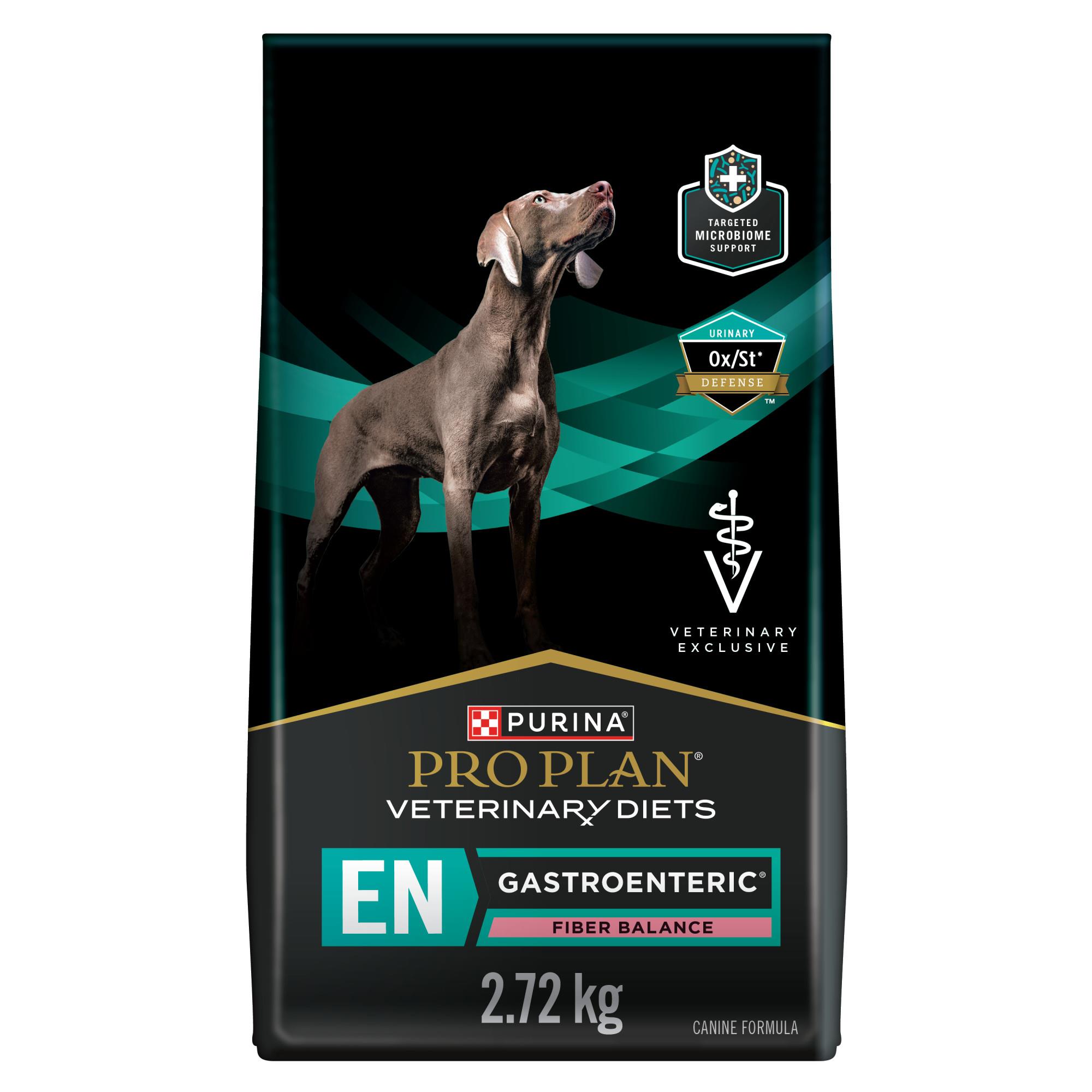 Purina Pro Plan Veterinary Diets EN Gastroenteric Fiber Balance Canine Formula is easy to digest and made with high-quality ingredients. This formula includes a unique blend of soluble and insoluble fibres to support GI health and complex carbohydrates to help moderate glucose absorption. The science behind our therapeutic diets represents a collaboration between Purina pet nutrition experts, researchers and veterinarians.,Whole grain corn, dried beet pulp, poultry by-product meal, corn protein meal, barley, animal fat preserved with mixed-tocopherols, pea fiber, glycerin, natural flavor, mono and dicalcium phosphate, wheat bran, dried whey, potassium chloride, fish oil, salt, calcium carbonate, L-Lysine monohydrochloride, choline chloride, Vitamin E supplement, zinc sulfate, ferrous sulfate, niacin (Vitamin B-3), manganese sulfate, Vitamin A supplement, calcium pantothenate (Vitamin B-5), thiamine mononitrate (Vitamin B-1), Vitamin B-12 supplement, copper sulfate, riboflavin supplement (Vitamin B-2), pyridoxine hydrochloride (Vitamin B-6), folic acid (Vitamin B-9), menadione sodium bisulfite complex (Vitamin K), calcium iodate, biotin (Vitamin B-7), Vitamin D-3 supplement, sodium selenite. E262022,The following feeding program is recommended as a guideline only, with discretionary clinical adjustments for proper weight maintenance. With your veterinarian’s approval, offer increasing amounts of the new food with decreasing amounts of the old food.