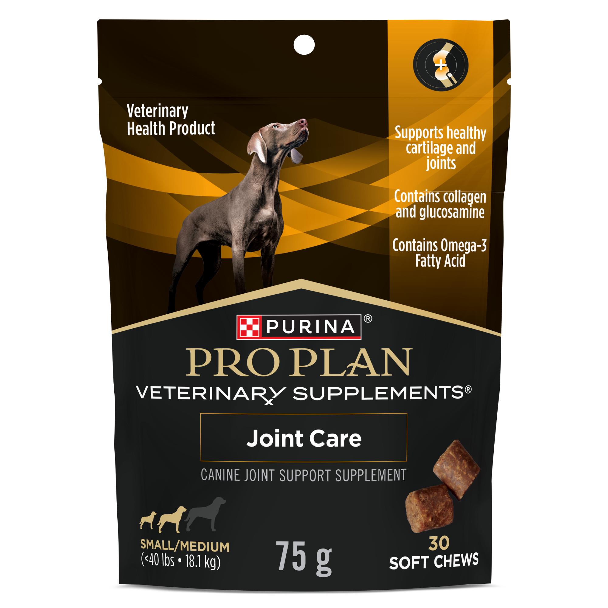 Purina® Pro Plan Veterinary Supplements® Joint Care is formulated to support mobility and normal daily activity, and contains glucosamine, collagen, chondroitin sulfate and hyaluronic acid to provide important building blocks to help maintain healthy cartilage and joints. The science behind Purina supplements represents a collaboration among Purina nutritionists, researchers and veterinarians.,Active Ingredients Per Chew (5 gram): Glucosamine Hydrochloride 245 mg, Hydrolyzed Collagen 240 mg, Chondroitin Sulphate 160 mg, Omega-3 Fatty Acids 60 mg, Hyaluronic Acid 8 mg. Inactive Ingredients: Animal Digest, Brewer’s Yeast, Citric Acid, Cod Liver Oil, Glycerin, Lecithin, Microcrystalline Cellulose, Natural Bacon Flavour, Silicon Dioxide, Sodium Chloride, Sodium Propionate, Tapioca Starch, Tocopherols, Water. A-9305-C.,Directions for use: For use in dogs only. Administer daily based on size of dog or as recommended by your veterinarian. 1 Chew = 5 g.