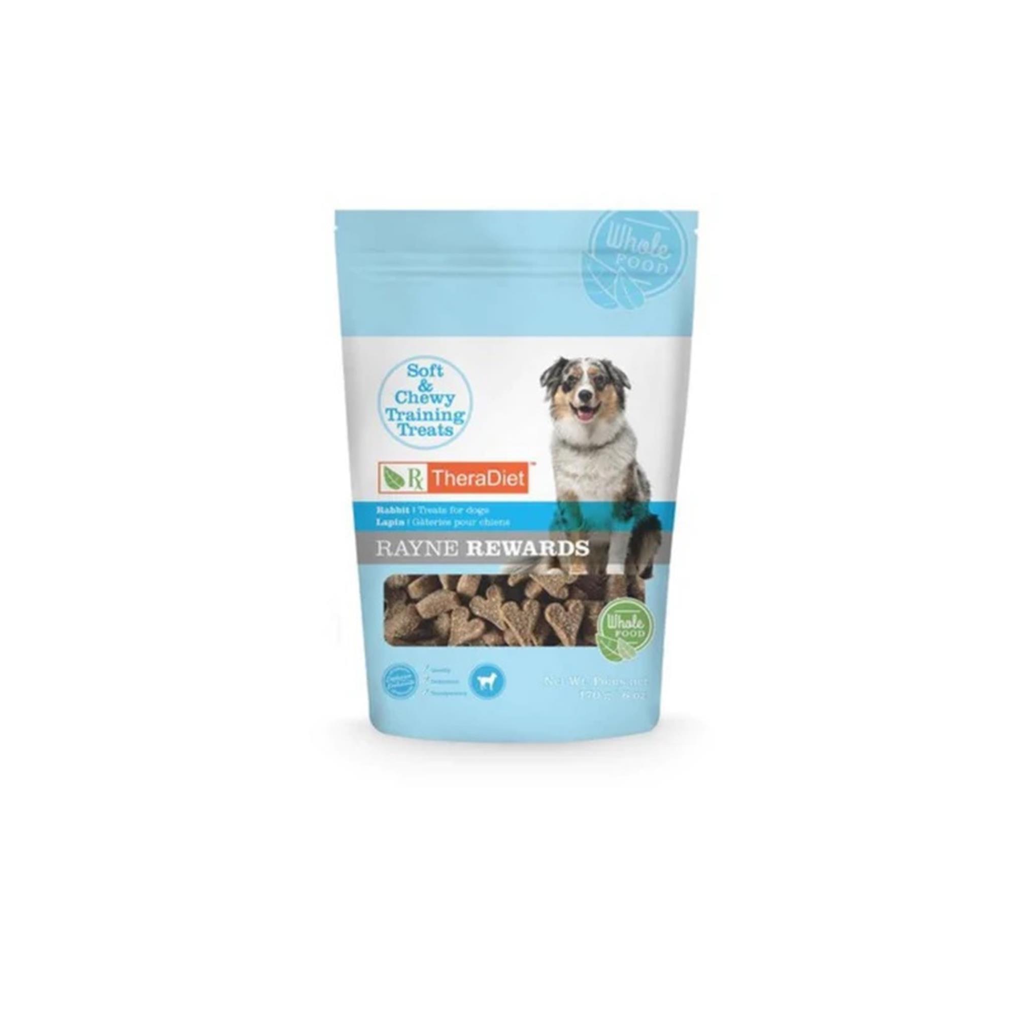 Rayne Rewards Rabbit Treats contain a single novel protein source (rabbit). Compatible with Rayne wet or dry diets.