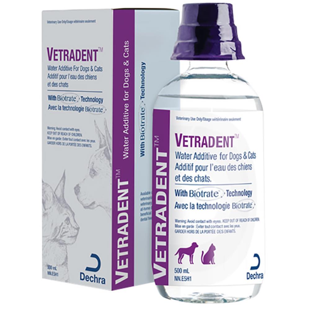 Vetradent features Biotrate™ technology that disrupts biofilms to help fight plaque, tartar, and freshen breath.,Sodium Citrate, Citric Acid, Zinc Chloride,Easy to use: Simply use the measuring cap to add 10 mL of Vetradent Water Additive per 250 mL of drinking water each time drinking water is added or replaced. Odourless, colourless and tasteless. Scientifically formulated to help fight plaque and tartar. Freshens breath.