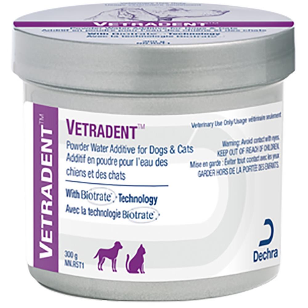 Vetradent features Biotrate™ technology that disrupts biofilms to help fight plaque, tartar, and freshen breath.,Sodium Citrate, Citric Acid, Zinc Chloride,Ideal for multi-pet households, or larger dogs that consume a lot of water. Add one scoop (6g) of Vetradent™ Powder to one litre of hot water. Mix until all powder dissolves, at least 30 seconds, and then allow water to cool before serving to your pet. Mix well before using. Scientifically formulated to help fight plaque and tartar. Freshens Breath.